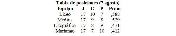Este campeonato duró más que el de la Liga Nacional Amateur, ya que concluyó el 27 de septiembre con victoria para el Liceo en reñida pelea con los Atléticos Medina (ver abajo tabla final de posiciones del 6 de agosto). Este triunfo se debió en buena medida al pitcheo de Guillermo Pareda, de F. Morín y de Valdés Pérez.