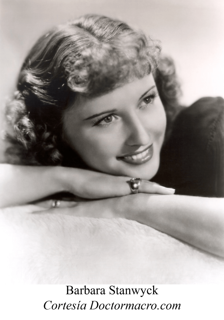 En la parte de las actrices hubo un grupo notable, donde aparecían las legendarias Bette Davis y Joan Crawford, las importadas Hedy Lamarr y Marlene Dietrich, más otras no menos exitosas en pantalla como lo fueron Loretta Young, Joan Fontaine, su hermana Olivia de Havilland, la muy convincente Gene Tierney, y otras, entre ellas Barbara Stanwyck, a la cual va dedicado este escrito.